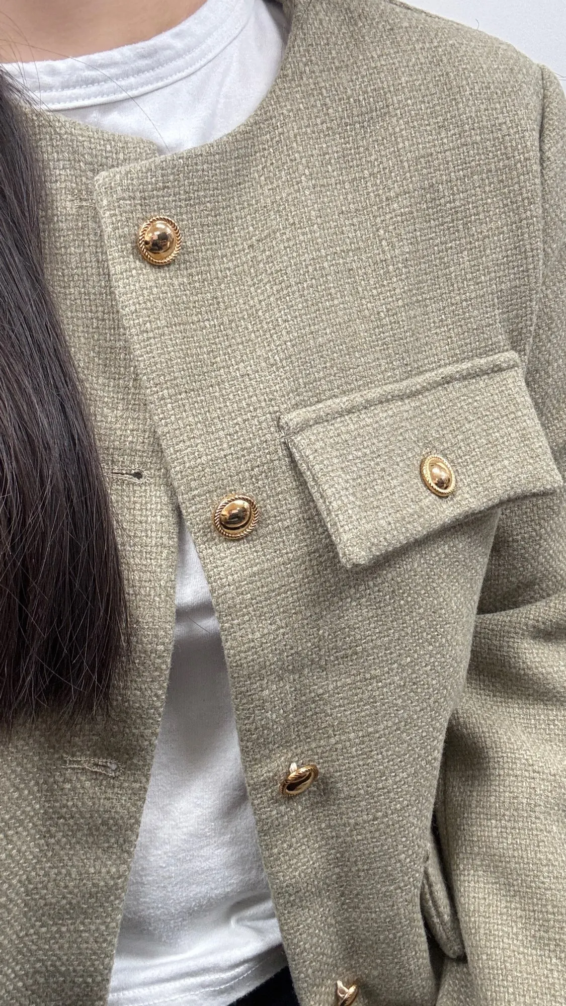Tweed Jacket Women – Cropped Khaki Casual O-Neck Buttoned Blazer