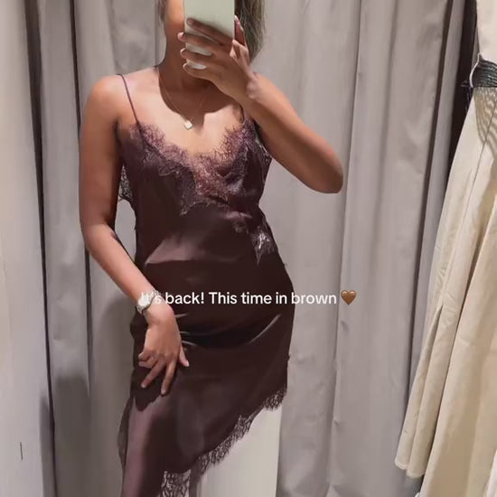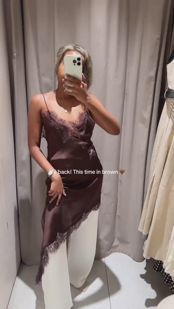 Embrace summer sophistication with this exquisite lace asymmetric slip dress. Its elegant silhouette and stylish design make it ideal for both casual outings and special occasions.