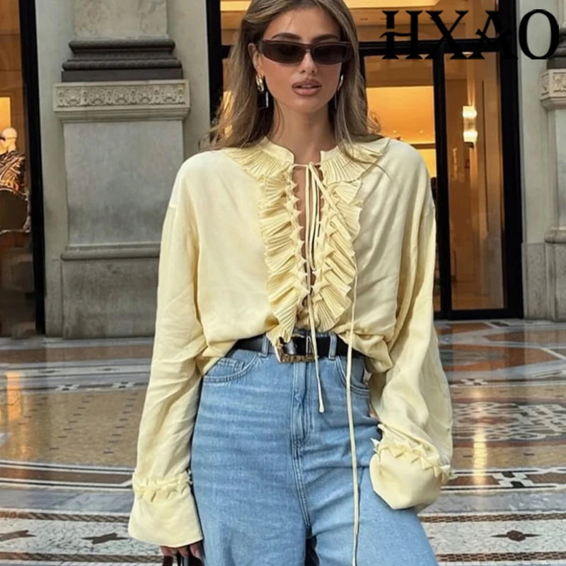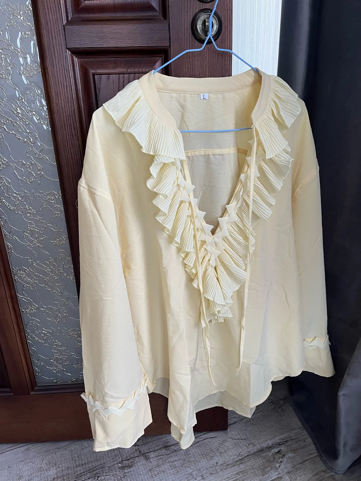 Elevate your autumn wardrobe with this stunning long blouse, designed for a comfortable and stylish fit. Perfect for various occasions, it features a charming ruffle detail and classic lace-up design that adds sophistication to any outfit.