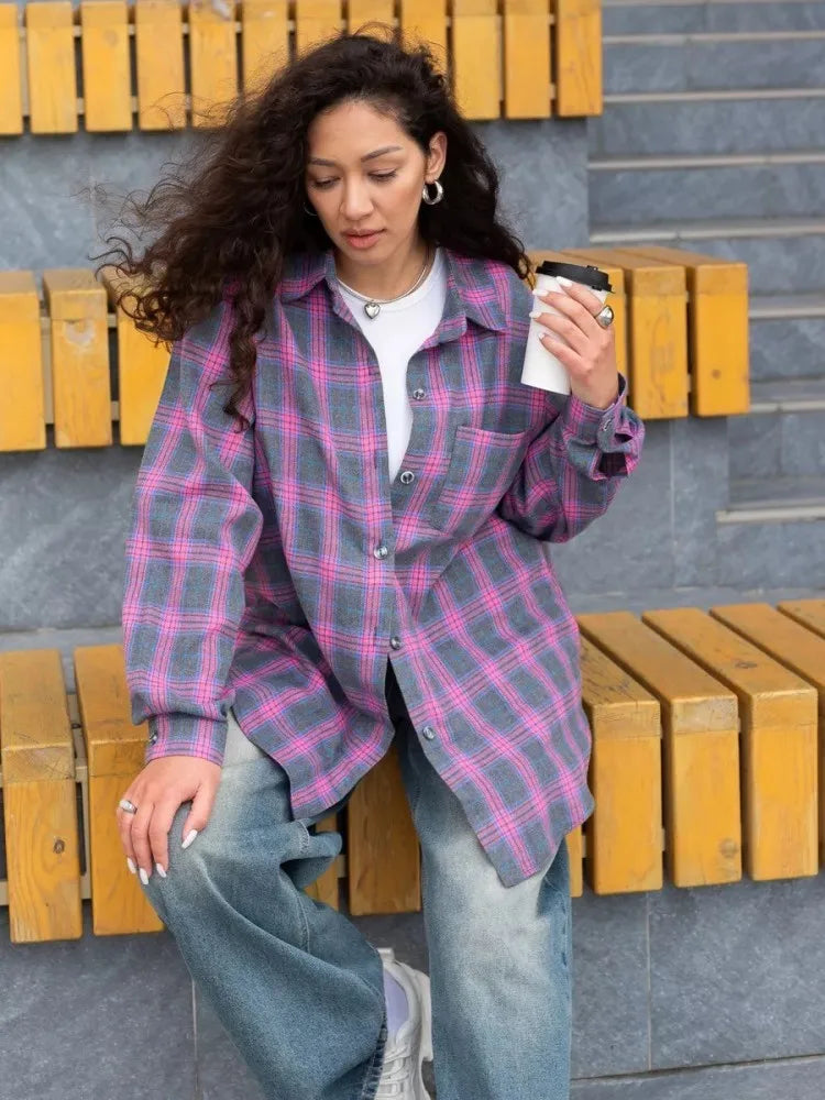 Vintage Oversized Plaid Shirt for Women – Long Sleeve Button Down Top